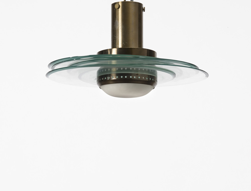 Max Ingrand (1908 - 1969) - Lampada a sospensione modello "2079". Produzione Fontana arte 1964 ca. Cinque dischi incrociati di cristallo molato, diffusore in vetro bianco satinato, struttura in ottone ossidato. (d cm 40) Bibiliografia: Quaderni Fontana Arte n. 6, 1964, p. 58