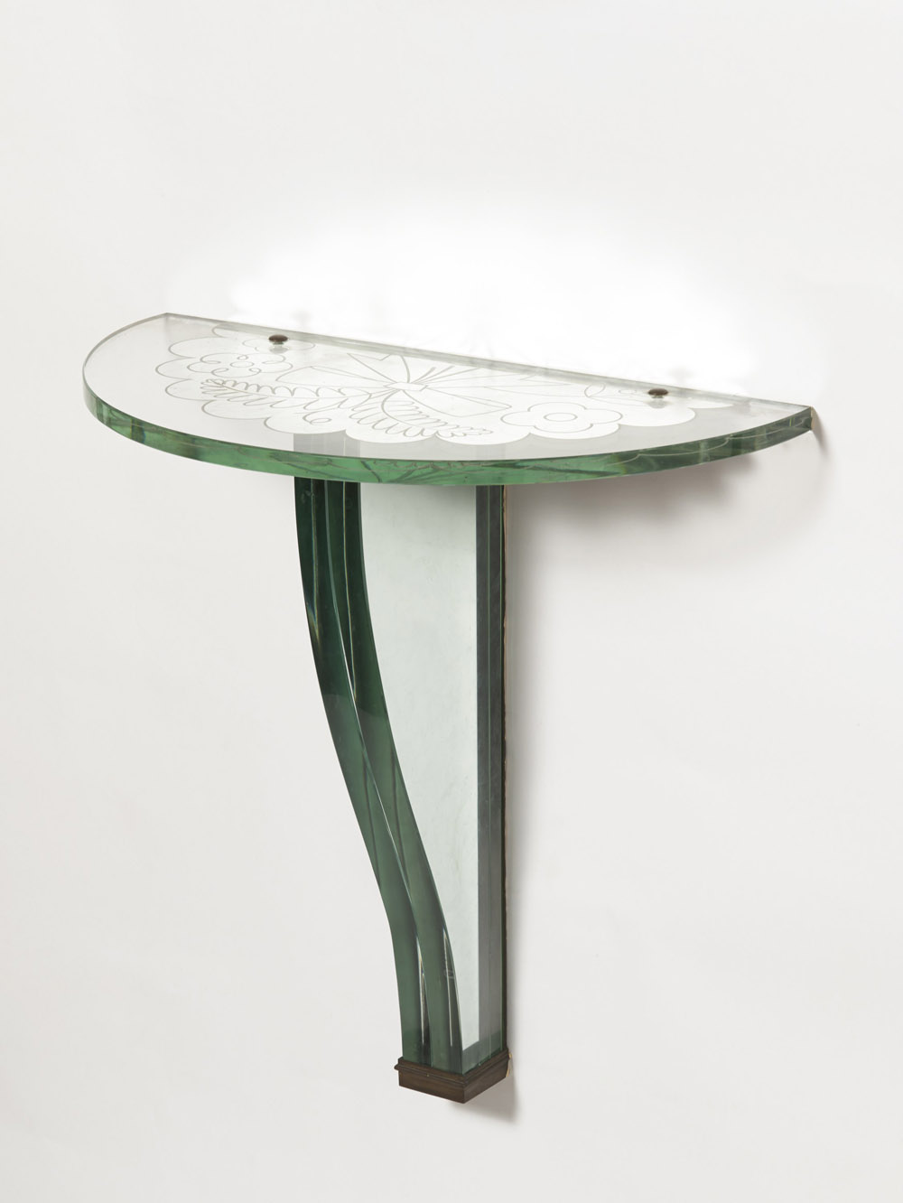 Pietro Chiesa (1892 - 1948) - Mensola-consolle con piano semi circolare in cristallo di forte spessore, decorato alla mola con fiori e nastro specchiati, montante centrale in ottone e due elementi in cristallo di forte spessore. Esecuzione Fontana Arte, Milano, anni 30. (cm 60x60x30) (lievi difetti)