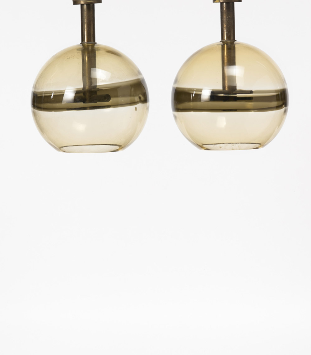 Manifattura di Murano - Coppia di lampade a sospensione a globo in vetro soffiato pagliesco con fasce ambrate. Struttura in ottone ossidato. Anni 60. (d cm 34) Provenienza: Hotel Royal, Spotorno