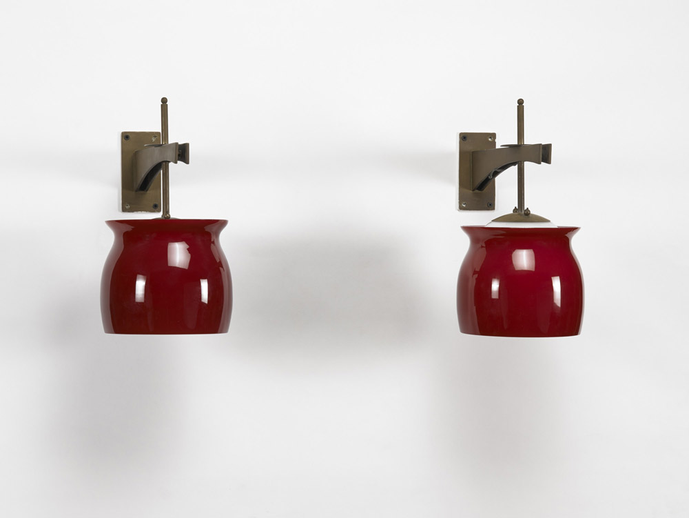 Massimo Vignelli (1931 - 2014) - Coppia di lampade da parete derivate dal disegno n. 4023 per lampada a sospensione. Venini, Murano, anni 50. Diffusore interno in vetro lattimo, calotta esterna in vetro incamiciato rosso, struttura in ottone. (cm 18x33x33) (lievi difetti) Fonti: disegno Venini n. 4023 e fotografie d’epoca datate aprile 1964. Bibliografia per il modello a sospensione: "Domus", n. 314 gennaio 1956, p. 46; "Domus", n. 342, maggio 1958, pp. 29-30; "Domus", n. 362, gennaio 1960, p. 55.