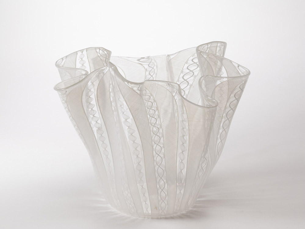 Fulvio Bianconi (1915 - 1996) - Vaso "fazzoletto" in vetro soffiato trasparente a canne di zanfirico lattimo. Venini Murano 1979. Firmato e datato a punta sotto la base (h cm 27) Bibliografia per esemplari simili: Fulvio Bianconi alla Venini, a cura di M. Barovier con C. Sonego, Skira, Milano 2015, p. 101