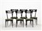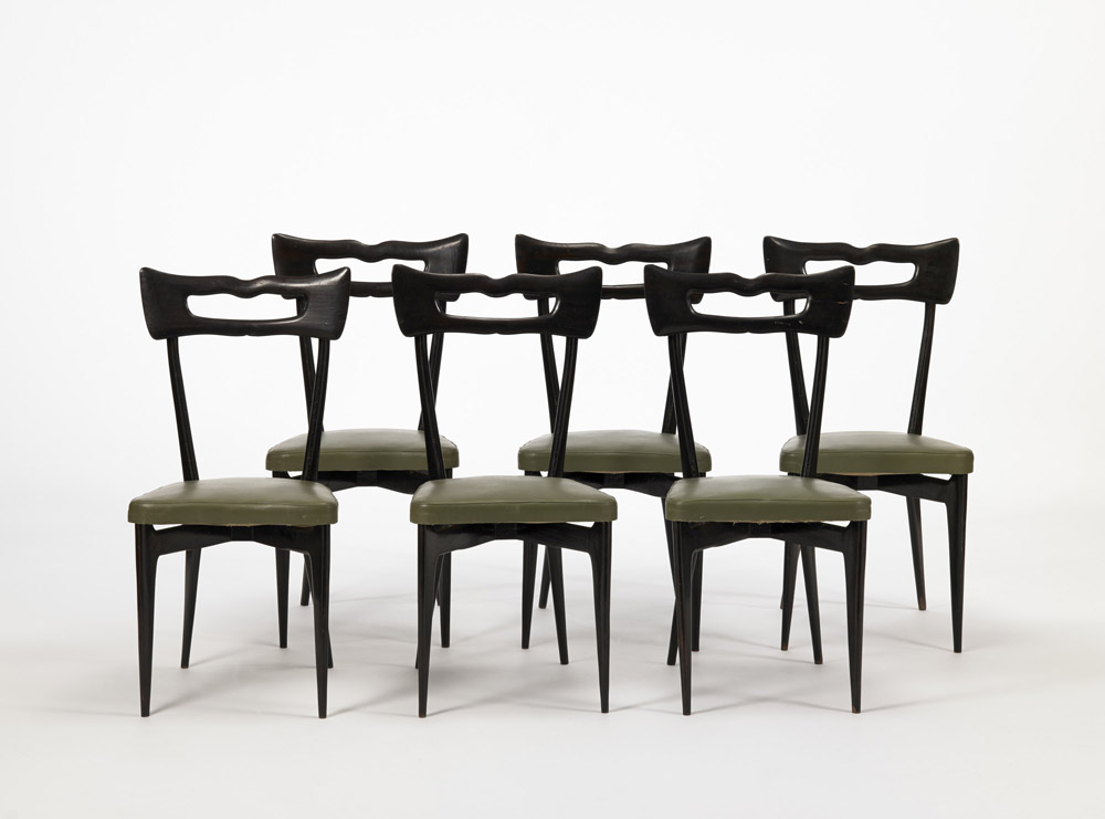 Lotto di sei sedie in legno ebanizzato con seduta in skai verde e schienalino in legno intagliato. Esecuzione italiana, Cantù anni 50 (lievi difetti)