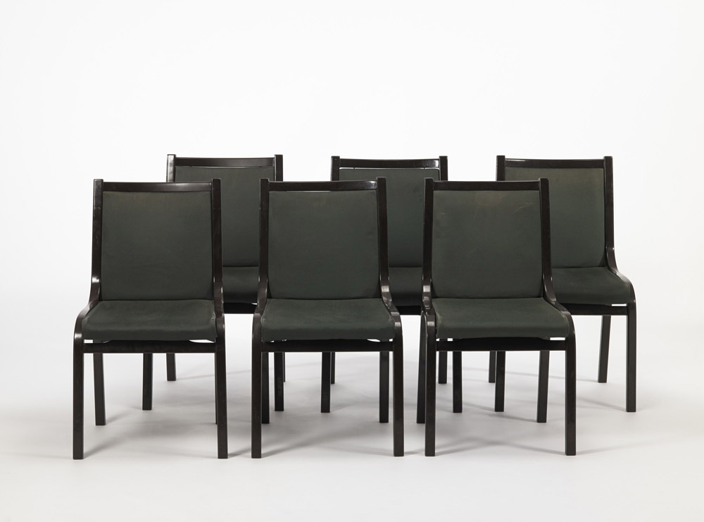 Vittorio Gregotti - Lodovico Meneghetti, Giotto Stoppino Lotto di sei sedie modello "Cavour". Produzione SIM, Novara 1959. Legno stratificato laccato testa di moro, rivestimento in tessuto verde. Segnalazione Compasso d’oro 1960. (lievi difetti) Bibliografia: G. Gramigna, Repertorio del Design Italiano 1950-2000, Allemandi, Torino 2003, p. 65.