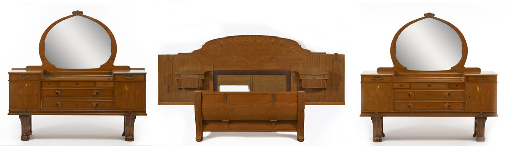 Carlo Bugatti (Milano 1856 - Molsheim 1940) - Sedia in legno massello di noce, quattro gambe mistilinee in noce brunito intarsiato in peltro con parte centrale sagomata a colonna e rivestita in lastre di rame sbalzato con motivi geometrici. Fine anni 80 inizi anni 90 del sec XX. Seduta in noce bicolore filettato in peltro, con losanghe in osso, intarsi in peltro con motivi vegetali, grafismi orientaleggianti e uccelli. Tondo centrale con intarsio in peltro raffigurante un uccello e rami. Schienale di analoga fattura con tondo centrale raffigurante una cicogna e comparto superiore a tondi e dischetti in rame e con motivi geometrici a sbalzo. (cm 38x102xx47) (leggeri difetti e piccole mancanze) Nota: Una sedia analoga fu di proprietà di Giovanni Segantini e Bice Bugatti, come testimoniato dalla fotografia dell'interno dello Chalet Kuomi a Maloja, databile al 1885-1886