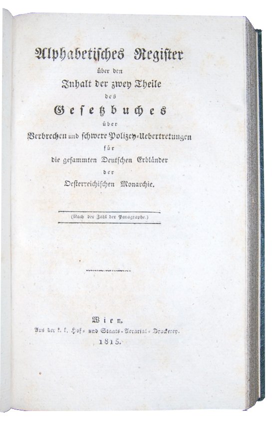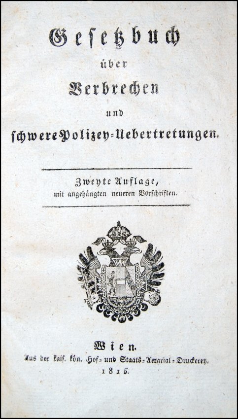 Gesetzbuch uber Verbrechen und schwere Polizey-Uebertretungen. Zweyte Auflage, mit angerhangten neueren Vorschriften. Wien: aus der kais. kon. Hof- und Staats-Aerarial-Druckerey, 1815.