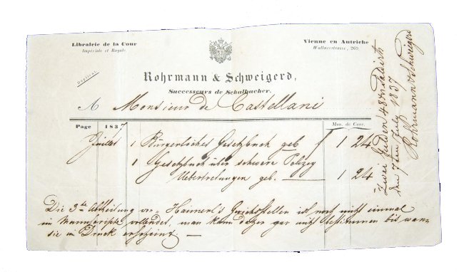 This book was purchased by Monsieur Castellani in 1837 together with another book in this auction (Burgerliches gesetzbuch), as for the invoice inserted as a free leaf in that book.