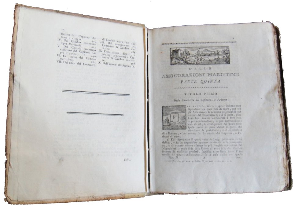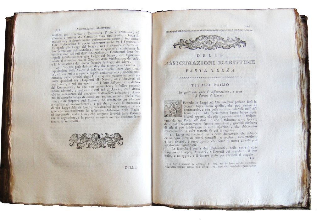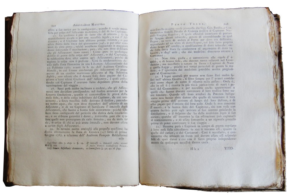 Scarce first edition of Baldasseroni's exhaustive treatise on maritime law that takes into consideration the insurance contracts referring, through a wide exemplification, the doctrine and law of several European countries —also giving as appendix the texts of the laws and current customs of maritime insurance in Europe.