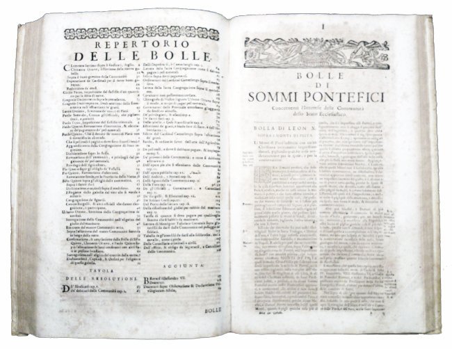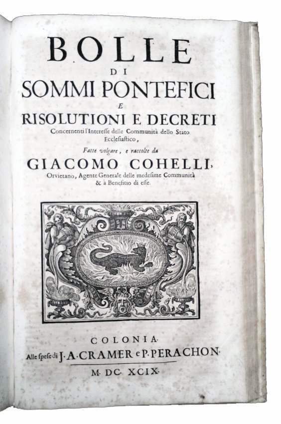 Coelli, Giacomo (editor and translator). Bolle di sommi pontefici e risolutioni e decreti concernenti l'interesse delle communità dello stato ecclesiastico, fatte volgare, e raccolte da Giacomo Cohelli, orvietano, agente generale delle medesime communità & a benefitio di esse. Coloniæ (Geneve): sumptibus J.A. Cramer & P. Perachon, 1699.