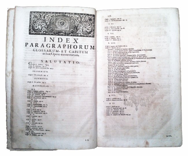 Half title: Jacobi Cohellii J.U.D. Commentaria in bullam X. Clementis papae VIII. De bono regimine et summorum pontificum bullae. Resolutiones et decreta. First title-page in black and red types, with a wide device representing the crowned salamander resurging by the flames; second part title-page in black types, with the same woodcut device as at the first part. Engraved head and -tail pieces, engraved headletters.