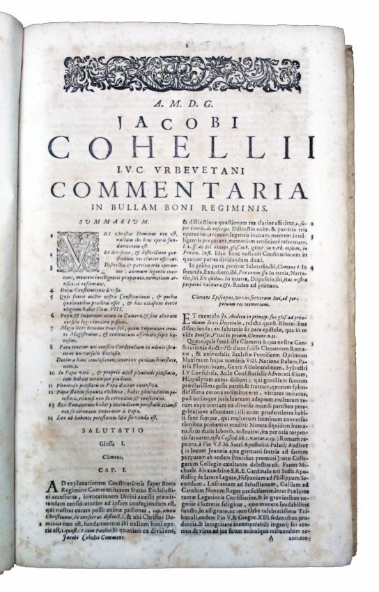 [Papal bulls, Geneve] Coelli, Giacomo. Jacobi Cohellii J.U.D. Urbevetani [...] Commentaria in Bullam X. Clementis papae VIII. De bono regimine rerum ad dictas universitates spectantium multiplici doctrina, & eruditione repleta, ac diu exoptata, Caroli Cartharij [...] studio ab inte ritu vindicata. Nec non Summorum pontificum bullae, ut & resolutiones & decreta dictarum universitatum interesse spectantia [...]. Coloniæ Allobrogum (Geneve): sumptibus J.A. Cramer & P. Perachon, 1699.