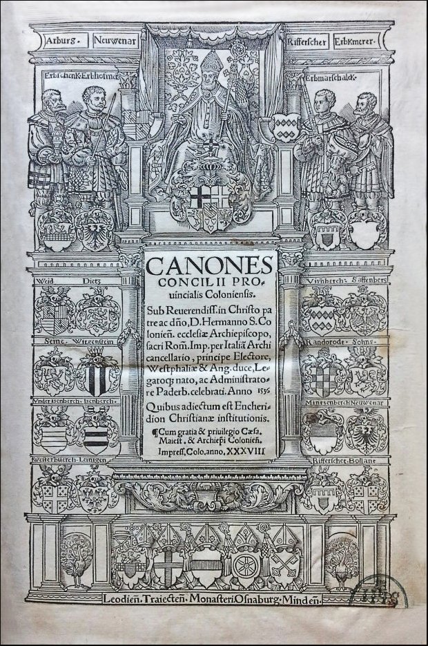 Gropper, Johann (editor).Canones Concilii Prouincialis Coloniensis: sub Reuerendiss. in Christo patre ac d[omi]no D. Hermanno S. Colonien[sis] Ecclesiae archiepiscopo ... celebrati, anno 1536: quibus adiectum est Encheridion [sic] Christianae institutionis. [Cologne]: Impress. Colo., anno XXXVIII [i.e. 1538]. [Colophon:] Ex aedibus Quentelianis, Anno domini, M.D. XXXVIII.