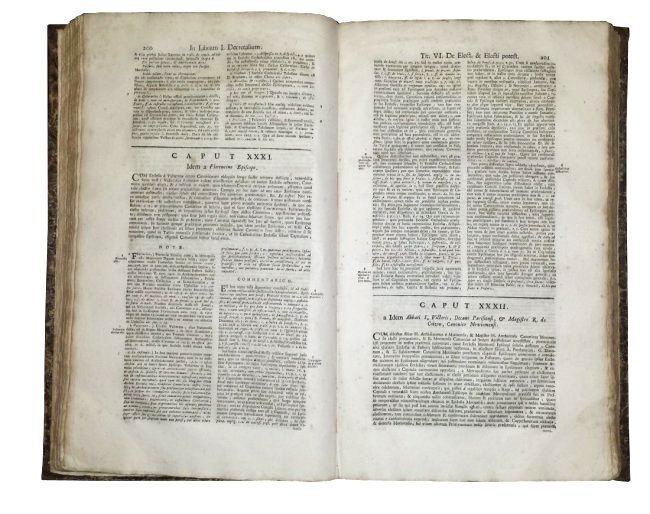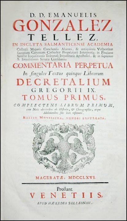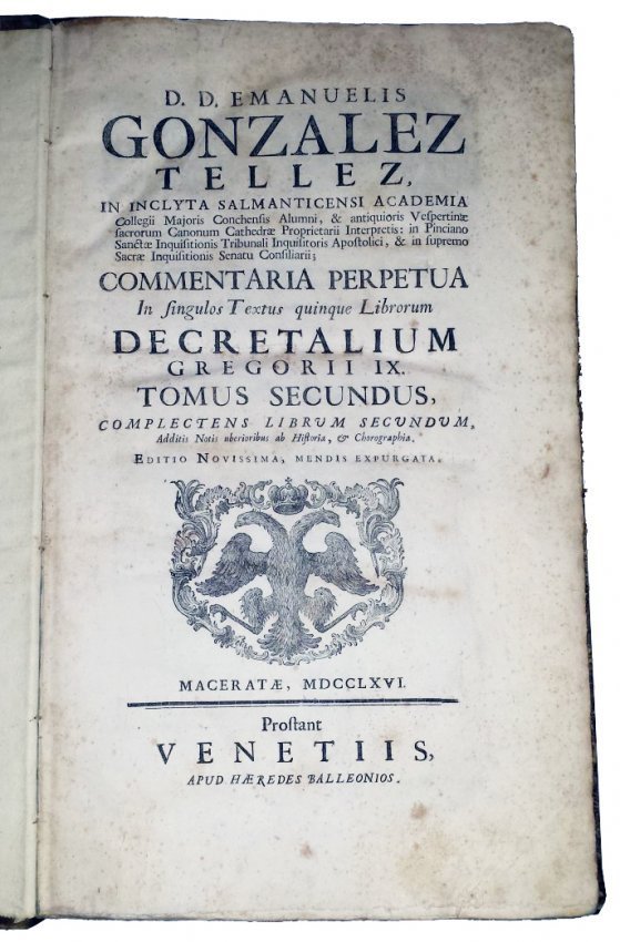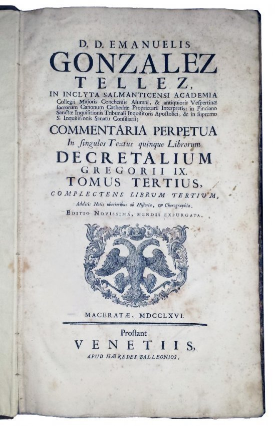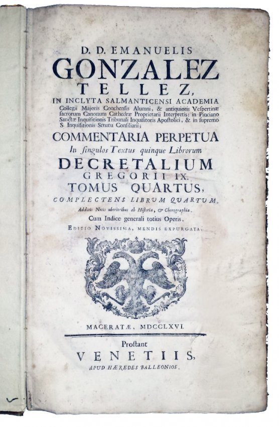 GONZÁLEZ TÉLLEZ, MANUEL. Commentaria perpetua in singulos textus quinque librorum decretalium Gregorii IX. Tomus primus [-quintus] [...] cum notis uberioribus ab historia, & chorographia, atque additionibus suis locis restitutis [...]. Maceratae; prostant Venetiis, apud haeredes Balleonios, 1766 [Venice: Baglioni, 1766].