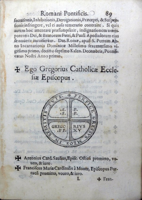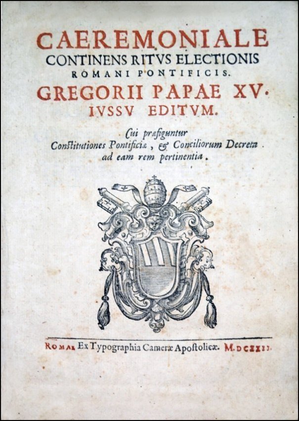 Gregorius XV. Caeremoniale continens ritus electionis Romani Pontificis. Gregorii Papae XV. iussu editum. Cui præfiguntur constitutiones pontificiæ, & conciliorum decreta ad eam rem pertinentia. Romae, Ex Typographia Camerae Apostolicae, 1622.