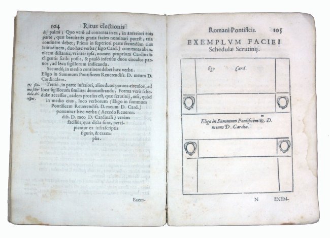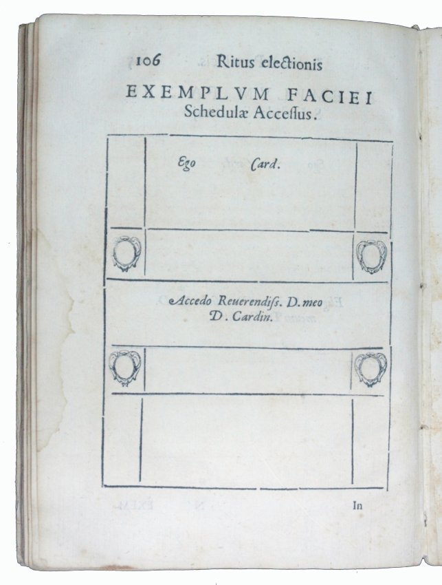Scarce edition of this Caeremoniale, the fundamental ceremonial book wanted by Pope Gregory XV containing the Constitutions and the Rules for the election of the Pope of the Catholic Church (see also lot 83). The work also contains the first known reproductions of the ballots used by cardinals for the election.