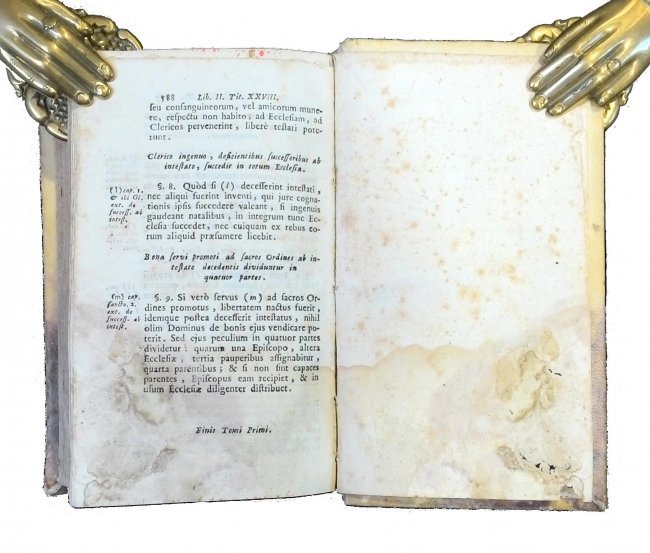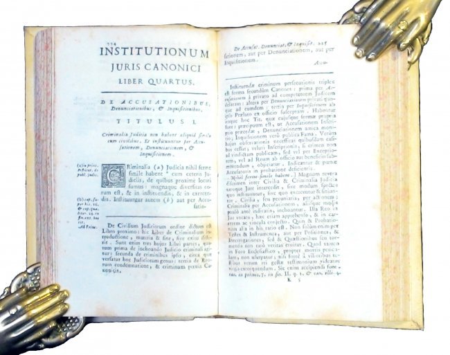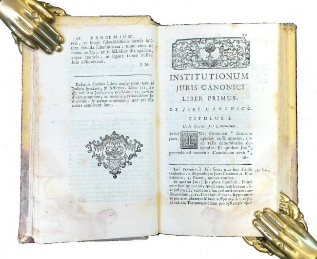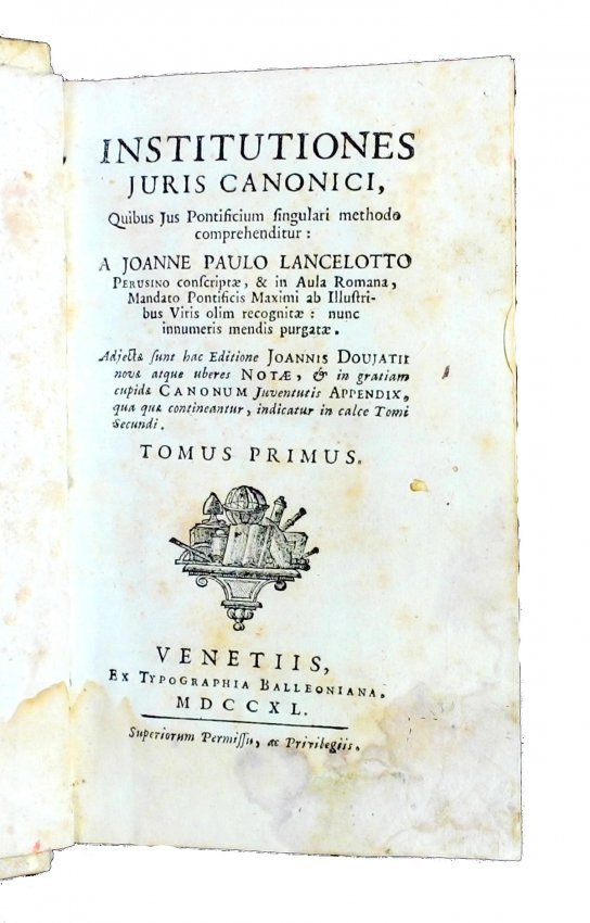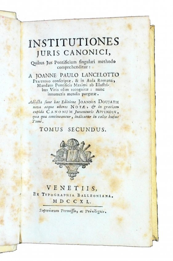 Lancellotti, Giovanni Paolo - Doujat, Jean. Institutiones juris canonici, quibus jus pontificium singulari methodo comprehenditur: a Joanne Paulo Lancelotto ... Adjecta sunt hac editione Joannis Doujatii novæ atque uberes notæ, & in gratiam cupidæ canonum juventutis appendix, qua quæ contineantur, indicatur in calce tomi secundi. Tomus primus (-secundus). Venetiis (Venice): ex Typographia Balleoniana, 1740.