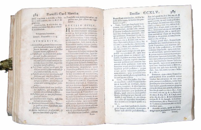 A collection of three hundred and seventy-five legal texts prepared for the Tribunal between February 1587 to May 1596, including indexes, compiled by the Card. Francesco Mantica and published after his death by his nephew Germanico.