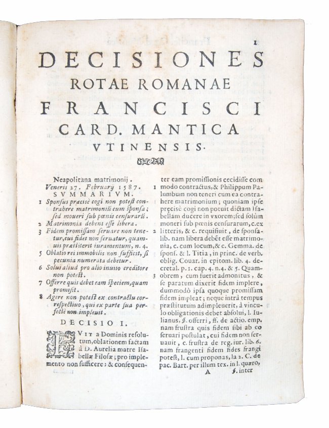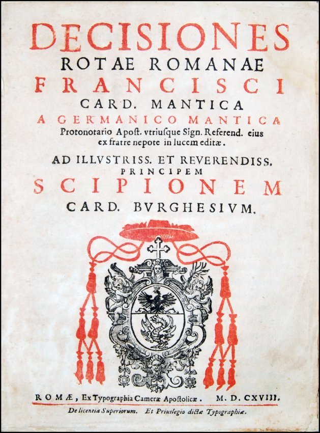 Stato Pontificio, Rota Romana. Decisiones rotae Romanae Francisci card. Mantica a Germanico Mantica [...] in lucem editae [...]. Romae: ex typographia Camerae Apostolicae, 1618.