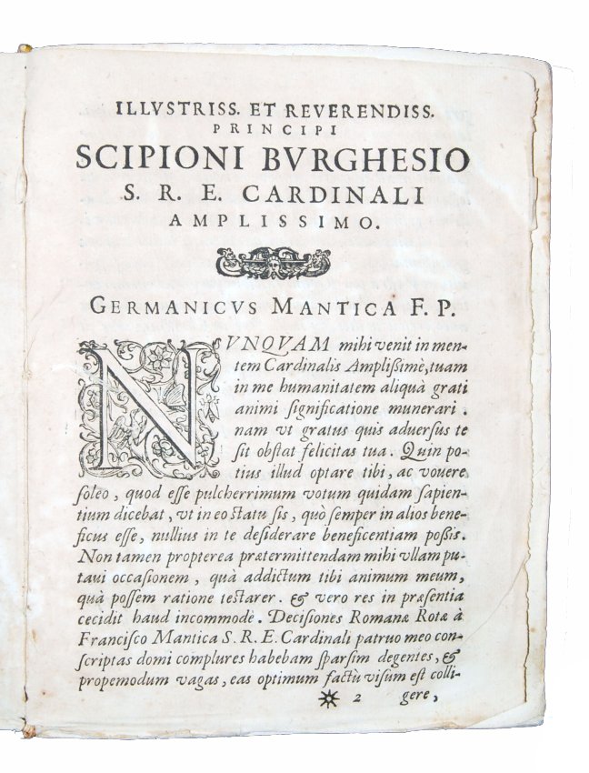 Dedicace by Germano Mantica to cardinal Scipione Borghese.