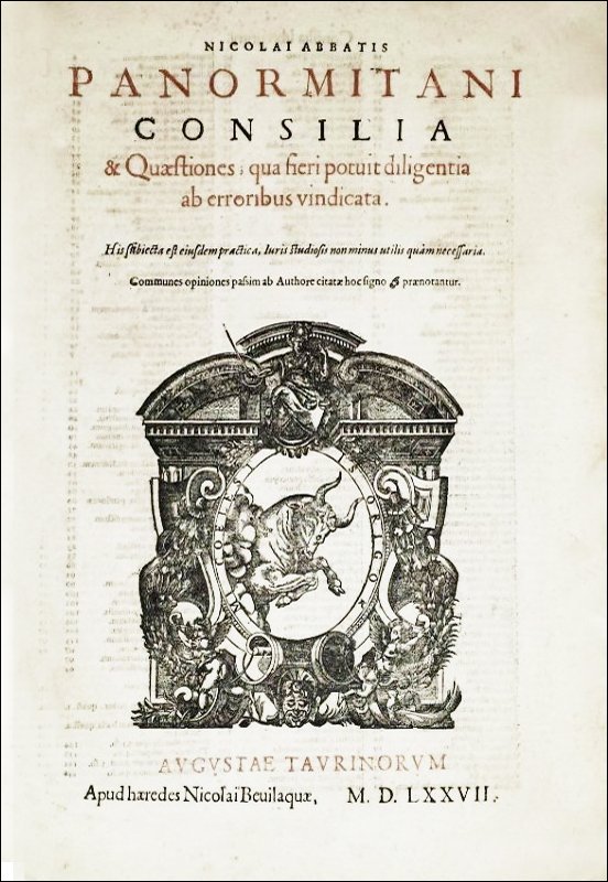 Tedeschi, Niccolò (Abbas Panormitanus). Nicolai Abbatis Panormitani Consilia & quaestiones, qua fieri potuit diligentia ab erroribus vindicata. His subiecta […] praenotantur. Augustae Taurinorum (Turin): Apud haeredes Nicolai Bevilaquae (eredi Niccolò Bevilacqua), 1577.