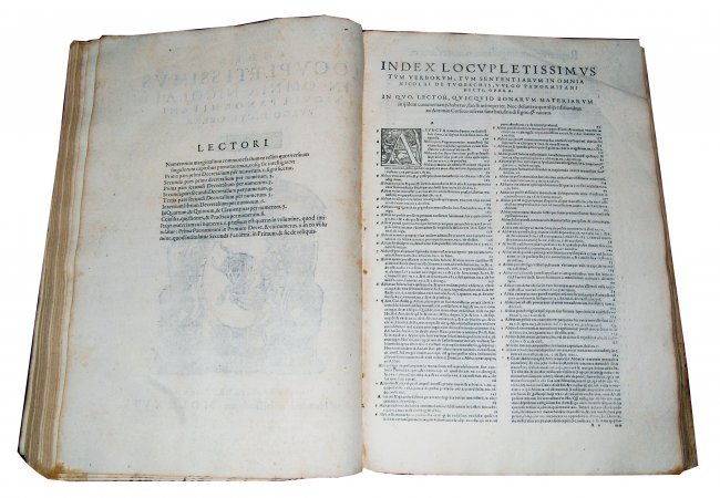 Title-page in red and black types at the first work (Consilia) and in black types at the second one (Index locupletissimus), both with a large typographical device (representing, in a decorated frame, a kicking bull who comes out of a cloud, with the Taurus constellation stars on its body and the motto: Mi coelestis origo.); Engraved head and -tail pieces, engraved headletters.