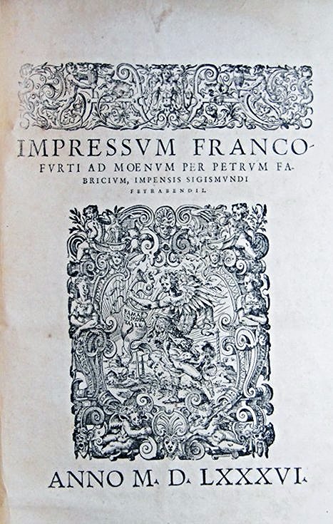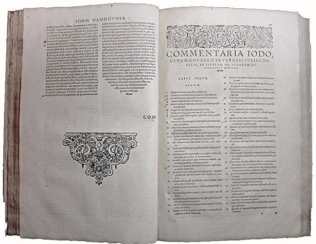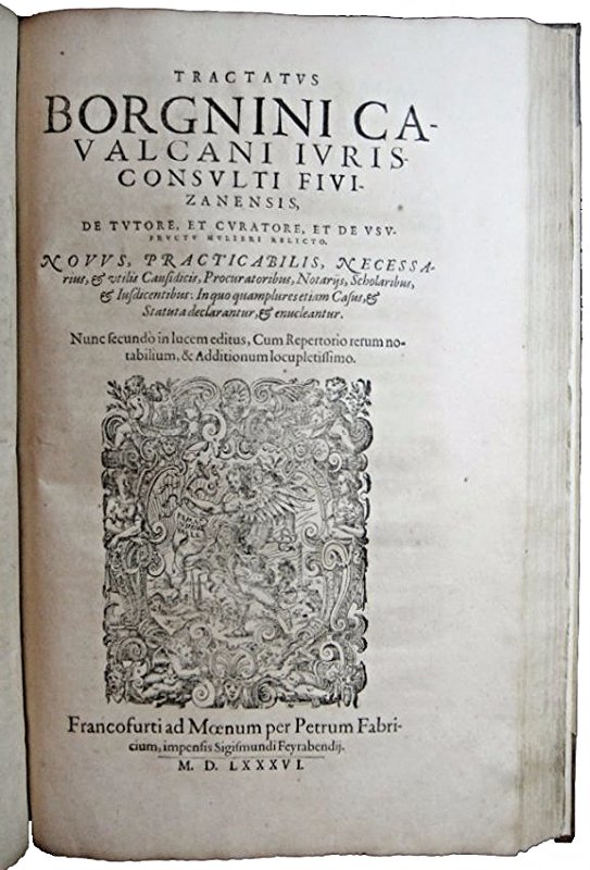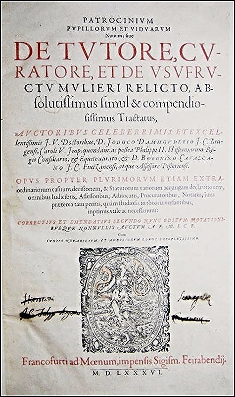 DAMHOUDER, JODUCUS – CAVALCANI, BORGNINUS. Patrocinium pupillorum et viduarum nouum; siue De tutore, curatore, et de vsufructu mulieri relicto, ... tractatus, auctoribus ... D. Iodoco Damhouderio I.C. Brugensi, ... & D. Borgnino Caualcano I.C. Fiuizanensi, .... Correctius et emendatius secundo nunc editum; notationibusque nonnullis auctum a F.M. Francisco Modio! I.C.B. Cum indice notabilium et additionum longe locupletissimo. Impressum Francofurti ad Moenum, per Petrum Fabricium, impensis Sigismundi Feyrabendii, 1586. (Frankfurt, Fabricius for Feyrabend, 1586).