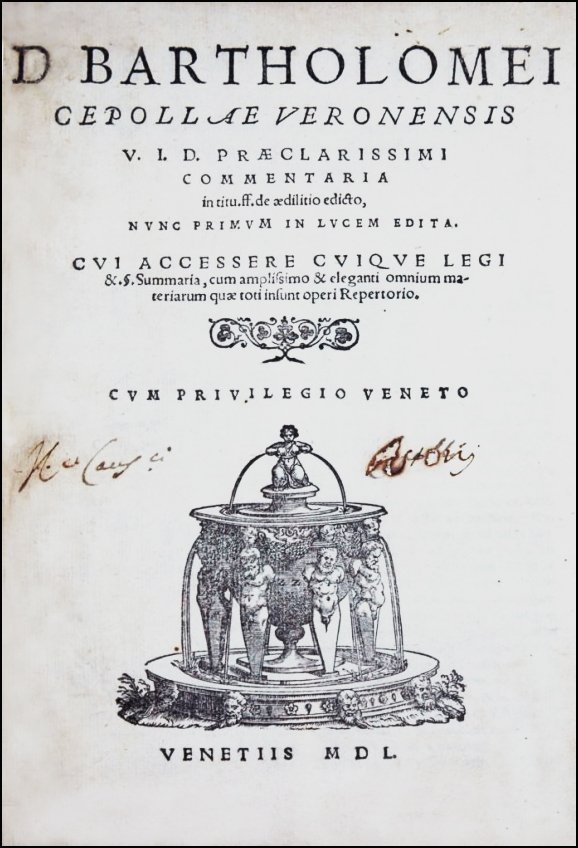 [Administrative Law, Buldings] Cipolla, Bartolomeo. D. Bartholomei Cepollae Veronensis v.i.d. praeclarissimi Commentaria in titu. ff. de aedilitio edicto, nunc primum in lucem edita. Cui accessere cuique legi & s. summaria, cum amplissimo [...] repertorio. Venice: [al segno della Fontana] 1550.