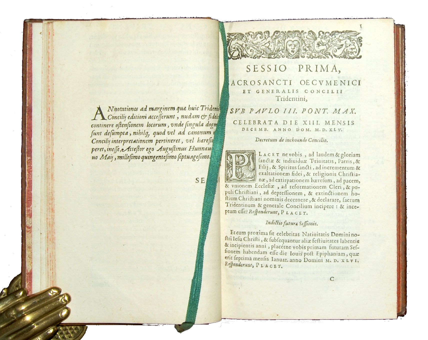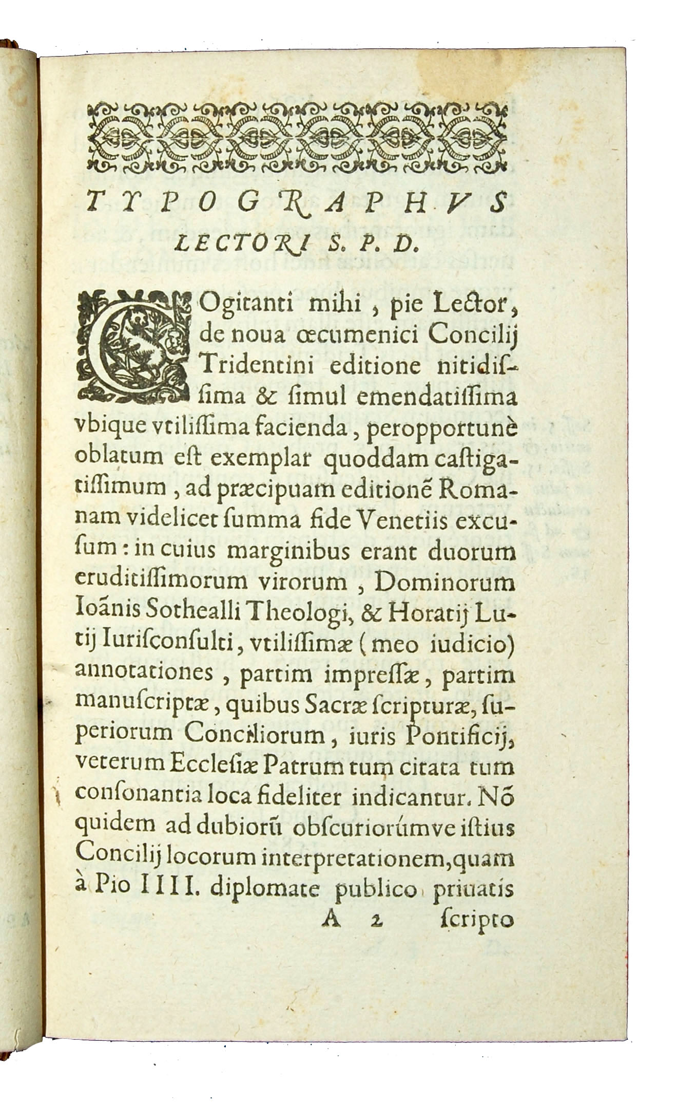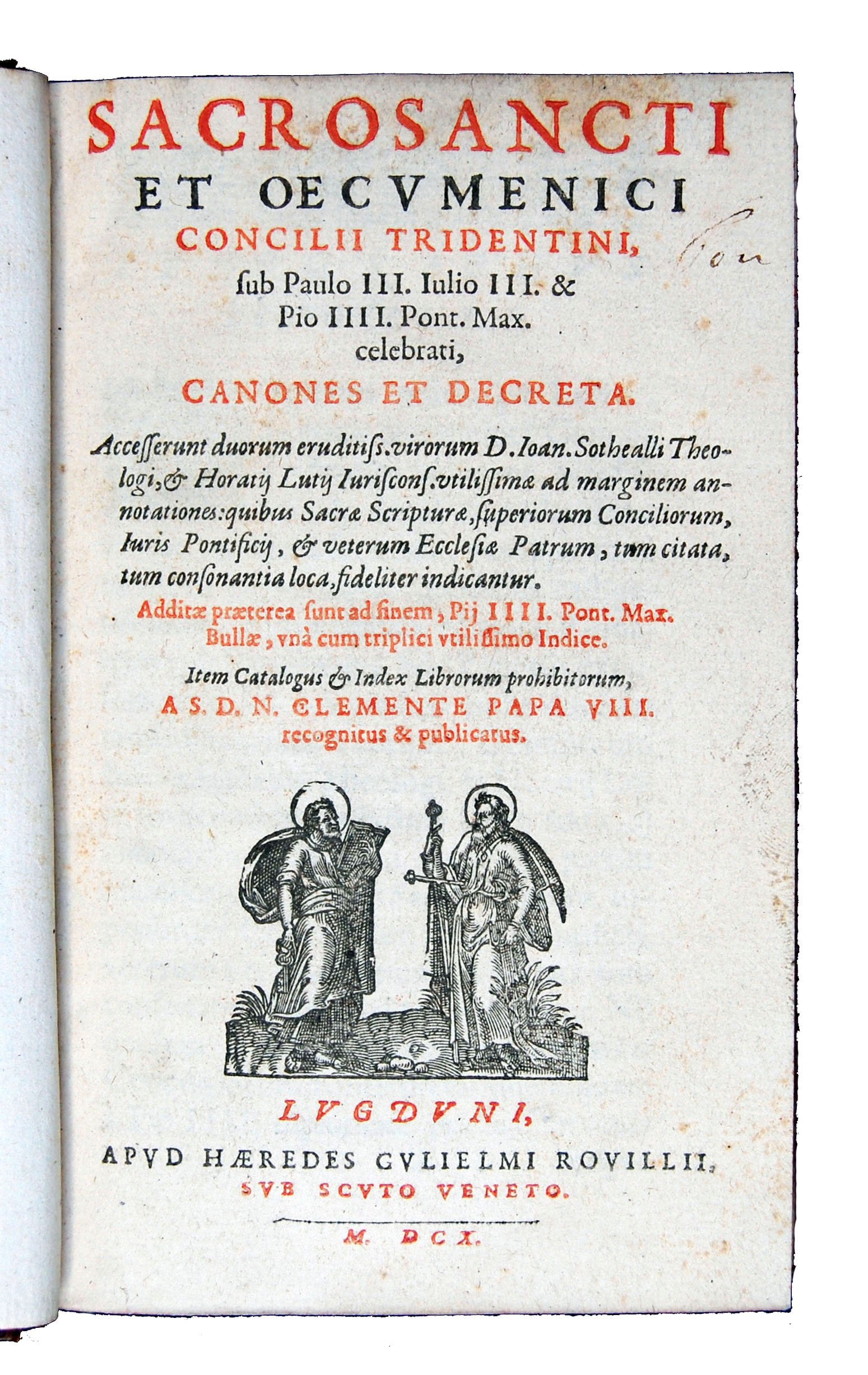 Concilio di Trento. Sacrosancti et oecumenici Concilii Tridentini, sub Paulo 3. Iulio 3. & Pio 4. pont. max. celebrati, canones et decreta. Accesserunt duorum eruditiss. virorum D. Ioan. Sothealli theologi, et Horatij Lutij iuriscons. vtilissimæ ad marginem annotationes [...] Additæ præterea sunt ad finem, Pij 4. pont max. Bullæ, vna cum triplici vtilissimo Indice. Item catalogus et Index librorum prohibitorum [...]. Lugduni: apud hæredes Gulielmi Rouillii sub Scuto Veneto, 1610.