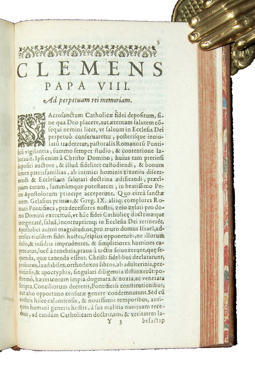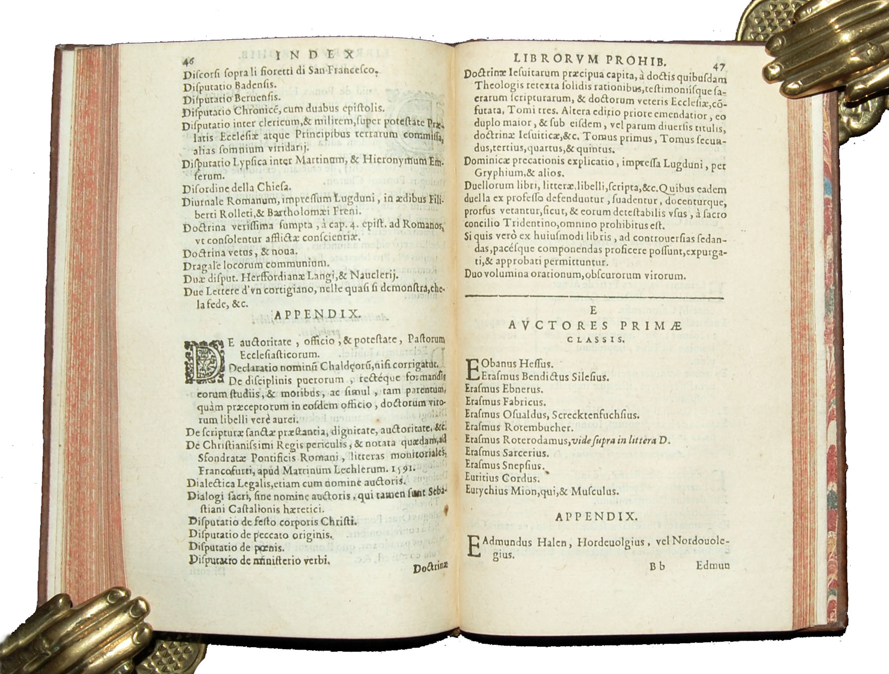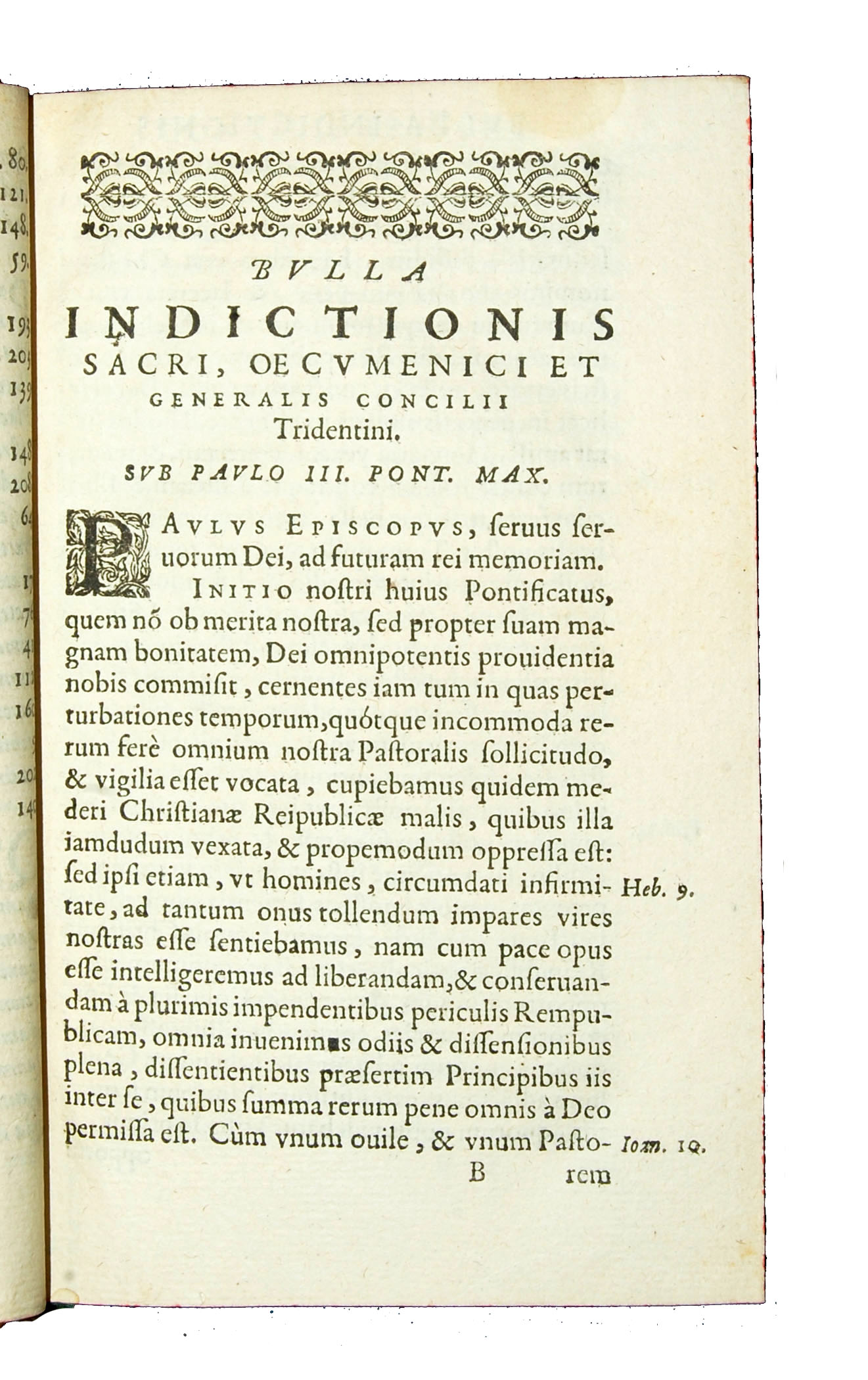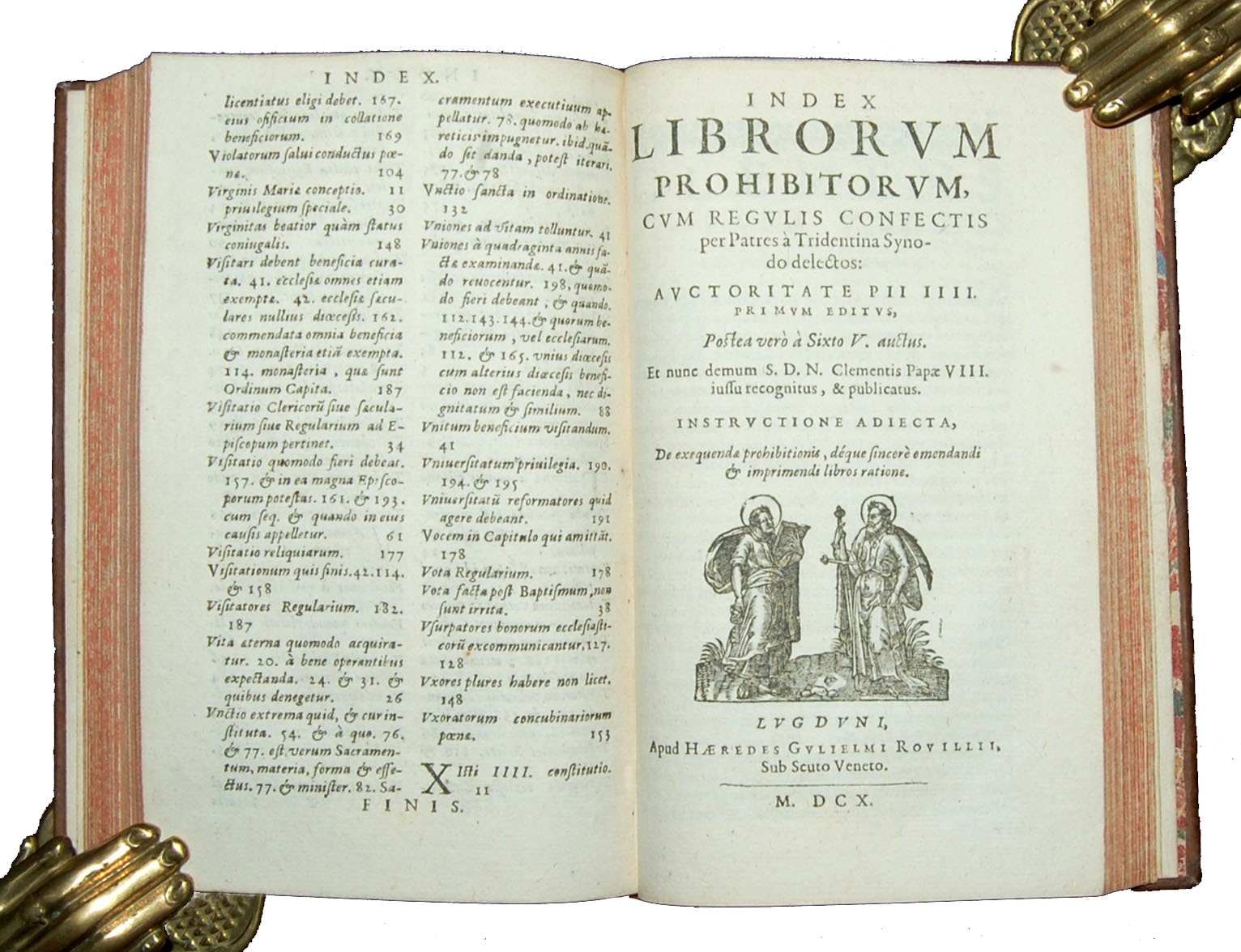 Fine copy of this rare Lyon edition of the Proceedings of the Council of Trent, including a second part (“The index of banned books”), with its own title-page: Index librorum prohibitorum, cum regulis confectis per patres à Tridentina synodo delectos: auctotitzte Pii 4. Primum editus, postea verò à Sixto 5. auctus. Et nunc demum S.D.N. Clementis papæ 8. iussu recognitus, & publicatus [...].