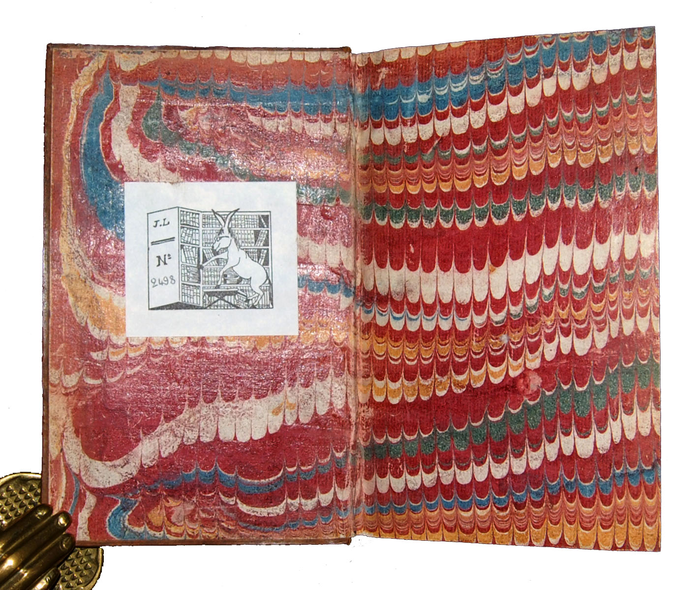 Provenance: Ex-libris label glued at first paste-down (initials: J.L.; a donkey with spectacles looking at a bookshelf).
