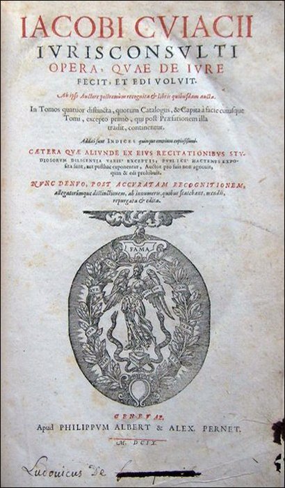 Cujas, Jacques. Iacobi Cuiacii Iurisconsulti, Operam quae de iure fecit et edi volvit. Ab ipso autore postremun recognita & libris quibusdam aucta. Genevae, apud Philippum Albert ex Alex, Pernet. 1609.