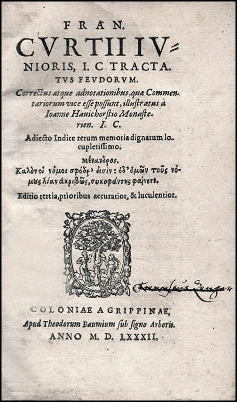 CORTI, FRANCESCHINO. Fran. Curtii iunioris ... Tractatus feudorum. Correctus atque adnotationibus, quae commentariorum vice esse possunt, illustratus a Ioanne Hauichorstio Monasterien. I.C. Adiecto indice rerum memoriam dignarum locupletissimo. Editio tertia, prioribus accuratior, & luculentior. Coloniae Agrippinae, apud Theodorum Baumium sub signo arboris, 1583.