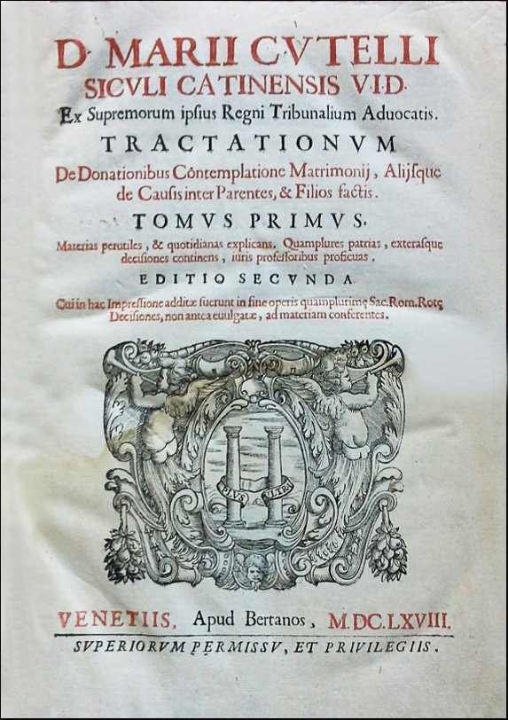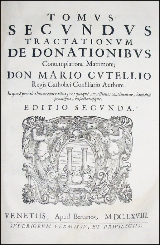 CUTELLI, MARIUS. D.Marii Cutelli siculi catinensis V.I.D. ex supremorum ipsius Regni Tribunalium advocatis. Tractationum de donationibus contemplatione matrimonii, aliisque de causis inter parentes, et filios factis. Tomus primus et secundus. Editio secunda. Cui hac impressione additae fuerunt in fine quamplurime Sac. Rom. Rote decisiones, non antea evulgate, ad materiam conferentes. Venetiis, apud Bertanos, 1668.