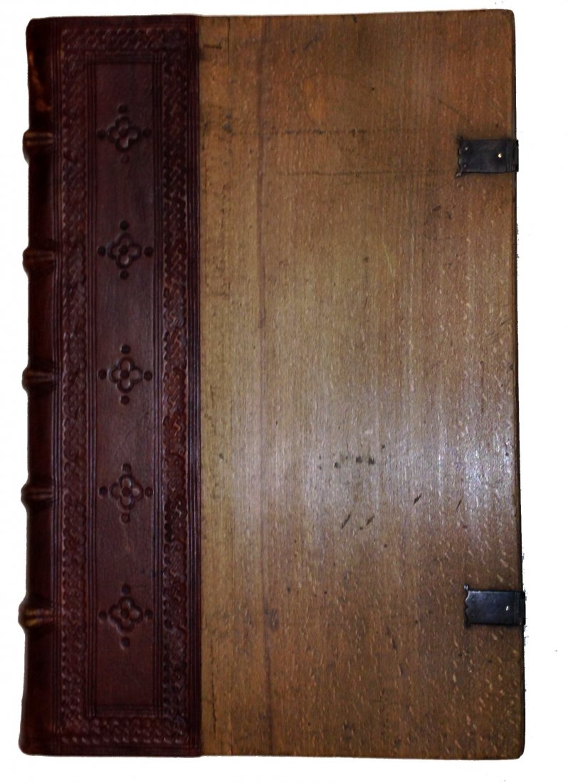 Folio, original ancient wooden boards (monastic binding), renewed calf spine with five raised bands and blind-tooled decorations, metal clasps, handwritten title at edge, ff. 168, [2]; ff. I-CXLIII, 145-202 (misnumbered), 1-106, (2, the last is blank).