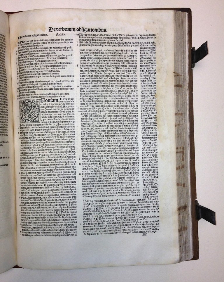 Tartagni, Alessandro. Aureu[m] opus excellentissimi. u.i. monarche Alexandri de Imola: super .j. [et] .ij. ff. vete. Summa cu[m] cura: o[mn]iq[ue] industria ex fidelissimis exe[m]plaribus excerptu[m] [et] in pristinu[m] nitore[m] eme[n]datu[m]. Cu[m] apostillis doctissimor[um] Doc. Fran. de Curte [et] Bernar. de Landriano: [et] cu[m] in numeris addi. q[uae] in alijs codicibus impressis no[n] reperiebant. Additis e[s]t addi. Do. Ant. Fra[n]cisci de Doc. necnon summarijs per spect. i.u. interpretem D[omi]n[u]m Nicolaum de Lacu compositis. Postremo aute[m] cu[m] vtilissimo Repertorio alphabetico singulares conclusiones dictor[um] per Alex. co[n]tine[n]te ac cu[m] copiosissimis additionib[us] Henrici Ferrandat Niuernen[sis] in hac vltima impressione in lucem editis.. (at colophon:) Lugduni : Impressa per Iacobum Mareschal. Impensis nobilium mercatorum Lugdunensium., Anno salutis dominice. M. ccccc. xx. de mense Decembris. (Lyon: Mareschal, 1520).