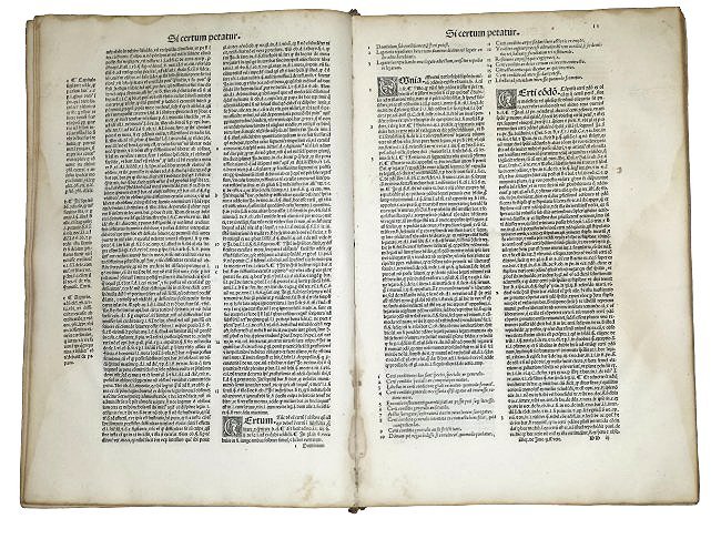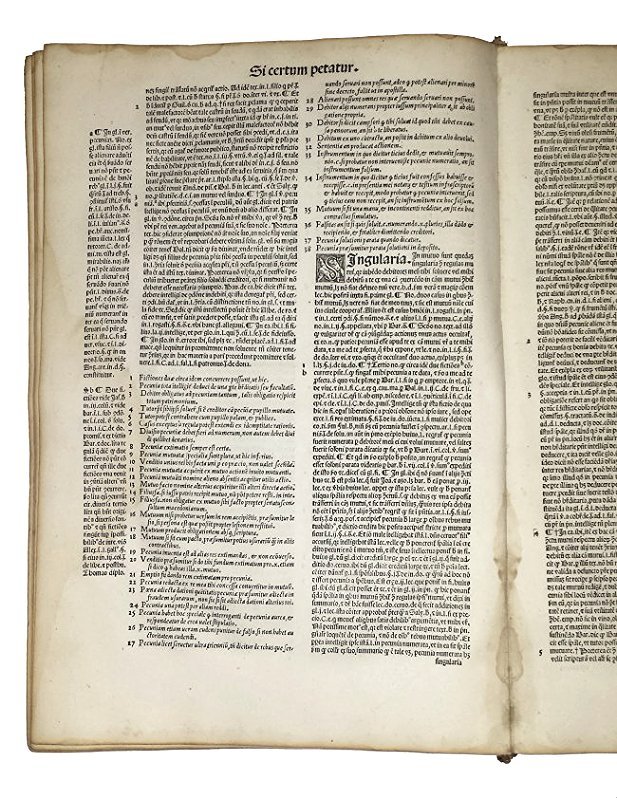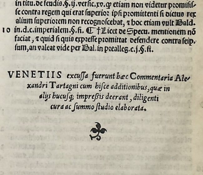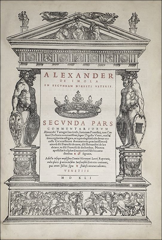 [Roman Law] Tartagni, Alessandro. Alexander de Imola In secundam Digesti veteris. Prima [-secunda] pars commentariorum Alexandri Tartagni Imolensis ... super Digesto veteri ... Cui accesserunt annotationes praeclarissimorum uirorum domini Francisci de curte, domini Bernardini de landriano, ac domini Francisci de doctoribus ... Adiecto insuper amplissimo domini Hieronymi Loreti Repertorio. Venetiis: [al segno della corona] 1541.