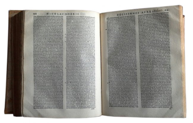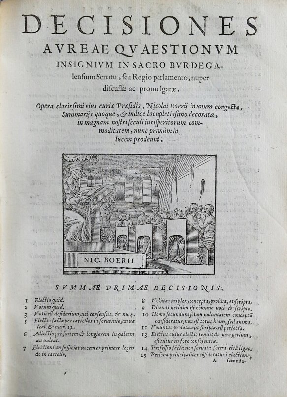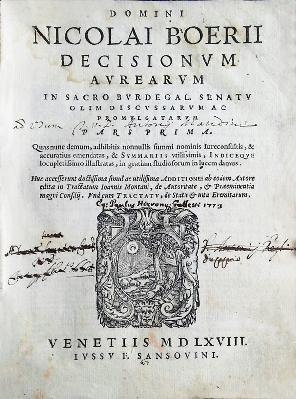De Bohier, Nicolas.Decisionum aureum in sacro Burdegal. senatu olim discussarum ac promulgatarum Pars prima. [et secunda] Quas nunc demum, adhibitis nonnullis summi nominis iureconsultis, & accuratius emendatas, & summariis vtilissimis, indiceque locupletissimo illustratas, in gratiam studiosorum il lucem damus. Huc accesserunt doctissimae simul ac utilissimae additiones ab eodem autore editae in tractatum Ioannis Montani. Venetiis, iussu F. Sansouini, 1568.