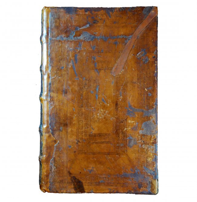 Folio (36 x 23 cm); full brown leather on wooden boards, with five raised bands spine, gilted title on a light brown label at spine, gilted decorations at spine and decorated blind tooling at boards, corner bosses (traces of missing clasps at the board-edges, traces of use, leather repairs); pp. XVI, 825, LXIX. Text in Latin, printed in two columns.