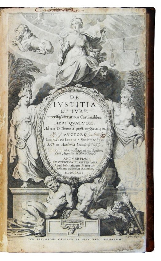 De Leys, Leonard (Lessio, Leonardo). De iustitia et iure ceterisque virtutibus cardinalibus libri quatuor, ad 2.2. D. Thomae a quaest. 47. usque ad q. 171. Auctore Leonardo Lessio e Societate Iesu […]. Editio quinta, auctior et castigatior cum appendice de Monte Pietatis. Antuerpiae (Antwerp): ex officina Plantiniana, apud Balthasarem Moretum et Viduam Jo. Moreti et Jo. Mursium, 1621.