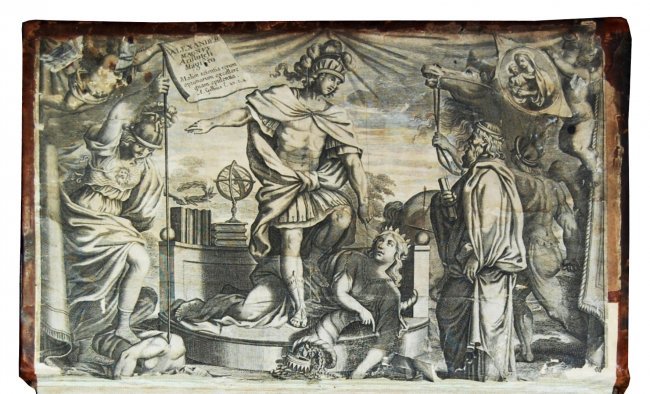 Nice full-page engraving, pasted at the front inside-cover, not referred to the work, representing Alessandro Magno (Alexander Magnus Aristoteli Magistro Malin scientia rerum optimarum excellere quam opulentia. A. Gellius).