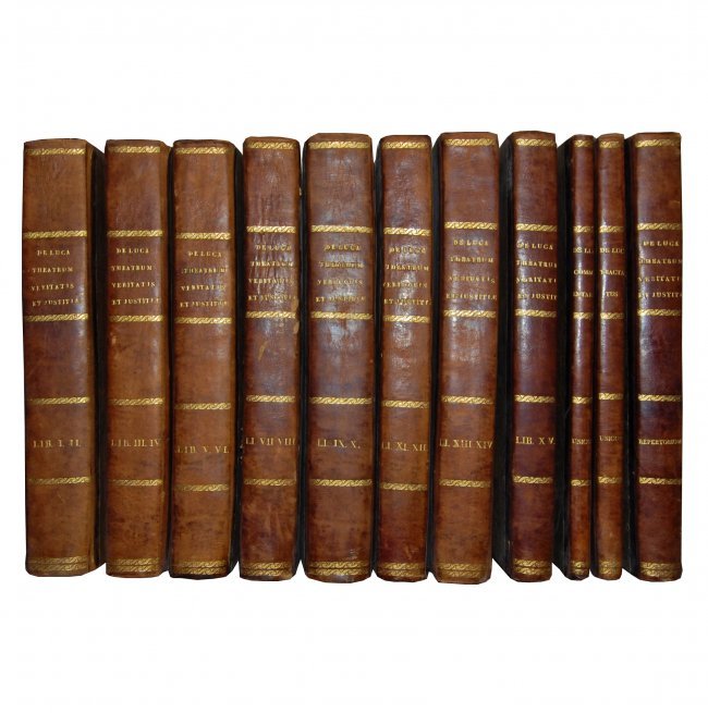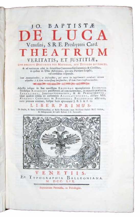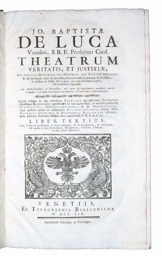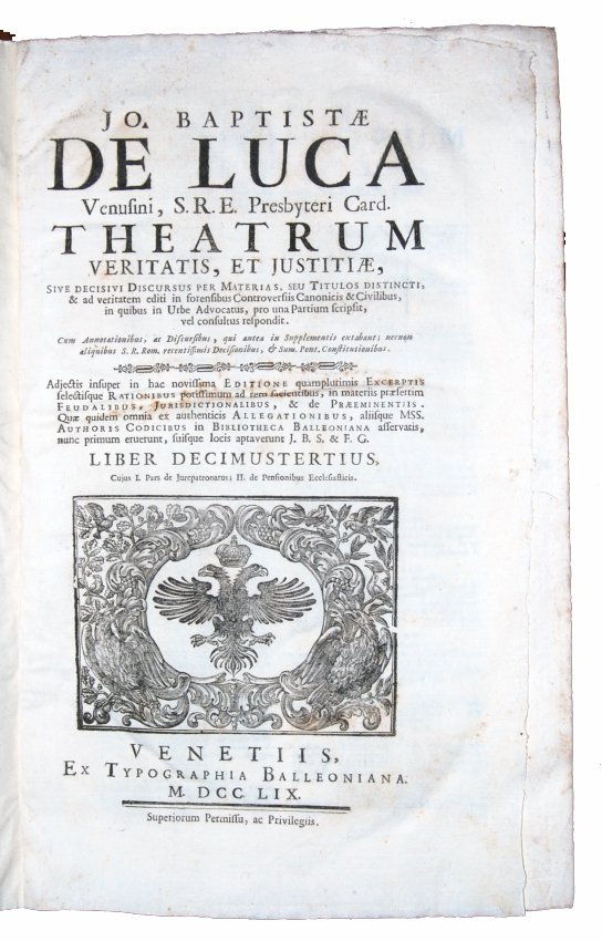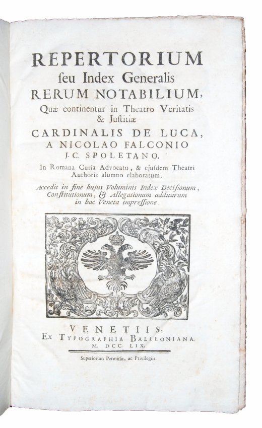 [1.]: Jo. Baptistae De Luca Venusini, [...] Theatrum veritatis, et justitiae, sive Decisivi discursus per materias, seu titulos distincti. & ad veritatem editi in forensibus controversiis canonicis & civilibus, in quibus in urbe advocatus, pro una partium scripsit, vel consultus respondit. Cum annotationibus, [...]. Adjectis, insuper in hac novissima editione. Liber primus [-decimusquintus]. Repertorium seu index generalis rerum notabilium quae continentur in Theatro Veritatis & Iustitiae cardinalis de Luca, a Nicolao Falconio [...]. Venetiis: ex typographia Balleoniana, 1759.