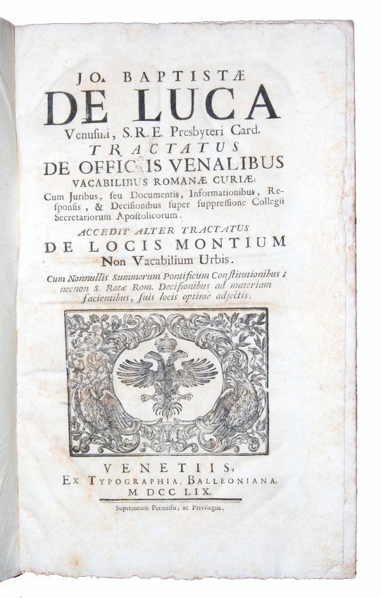 [3.]: Jo. Baptistae De Luca Venusini, [...] Tractatus de officiis venalibus vacabilibus Romanae curiae; cum juribus [...]. Accedit alter tractatus de locis montium non vacabilium Urbis. Cum nonnullis [...] optime adjectis. Venetiis: ex typographia Balleoniana, 1759.