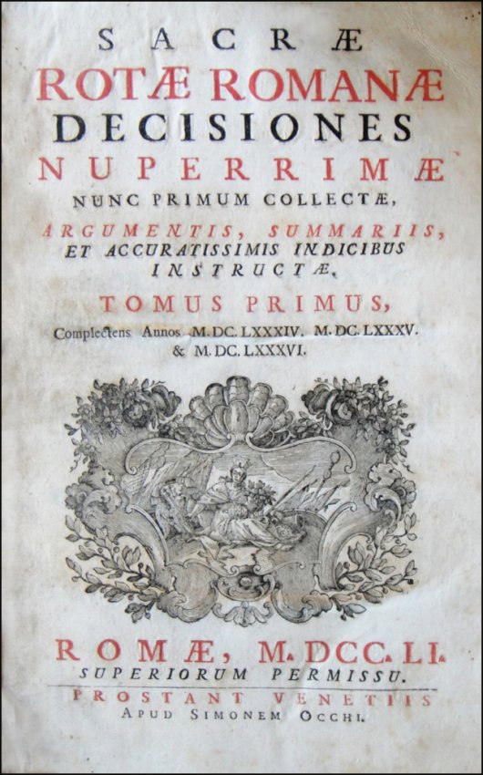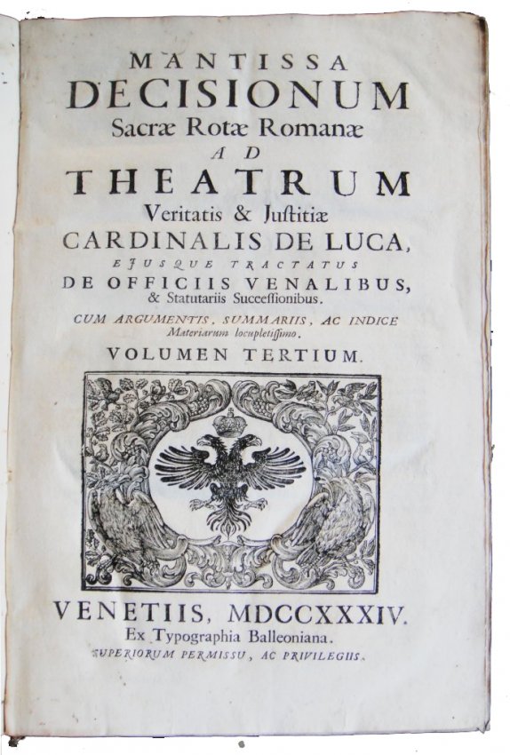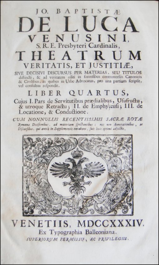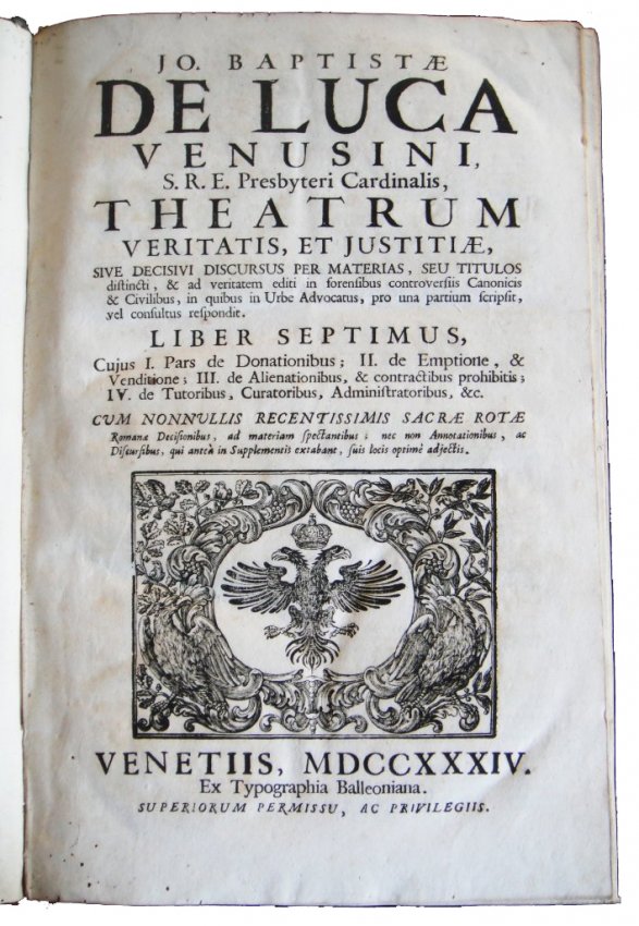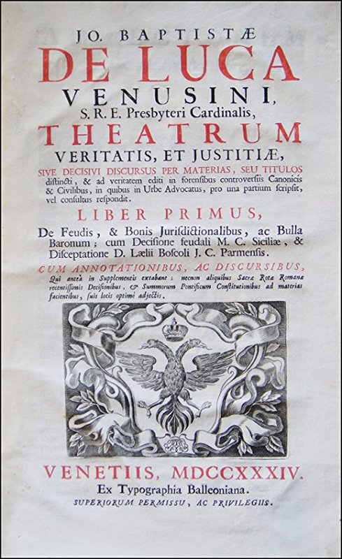 De Luca, Giovanni Battista.Jo. Baptistae De Luca Venusini, S.R.E. Presbyteri Cardinalis, Theatrum veritatis, et justitiae, sive, Decisivi discursus per materias, seu titulos distincti : & ad veritatem editi in forensibus controversiis canonicis & civilibus, in quibus in urbe advocatus, pro una partium scripsit, vel consultus respondit : cum annotationes, ac discursibus, qui anteà in supplementis extabant, necnon aliquibus Sacrae Rotae Romanae recentissimis decisionibus, & summorum pontificum constitutionibus ad materias facientibus, suis locis optimè adjectis..Venetiis : Ex typographia Balleoniana, 1734.