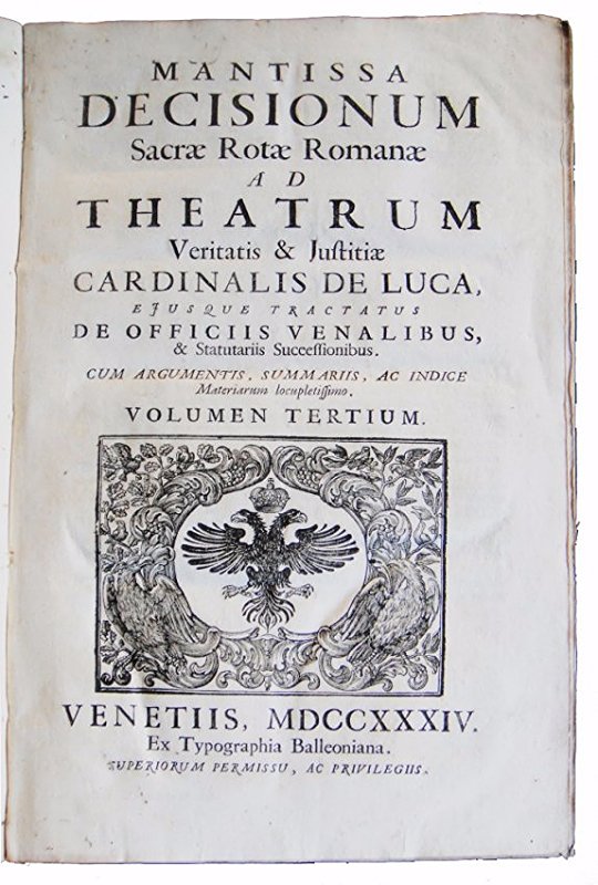 De Luca, Giovanni Battista.Mantissa decisionum Sacrae Rotae Romanae.Venetiis : Ex typographia Balleoniana, 1734.