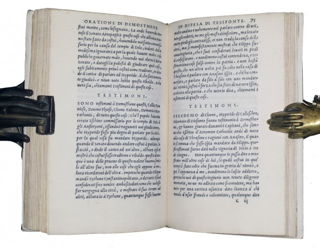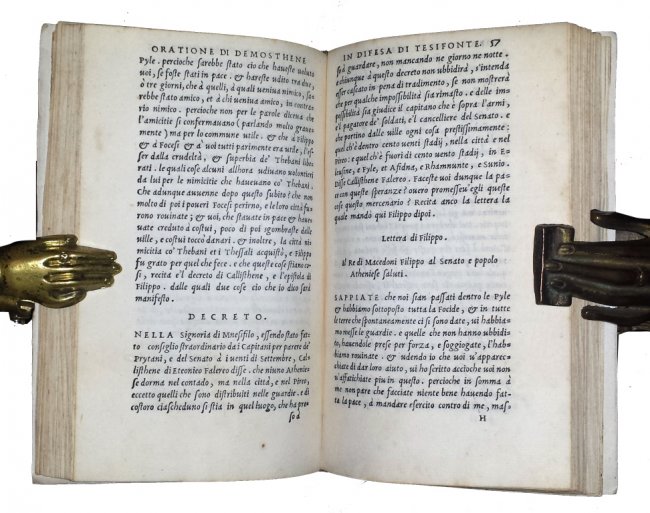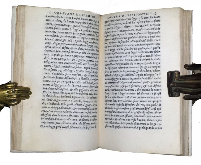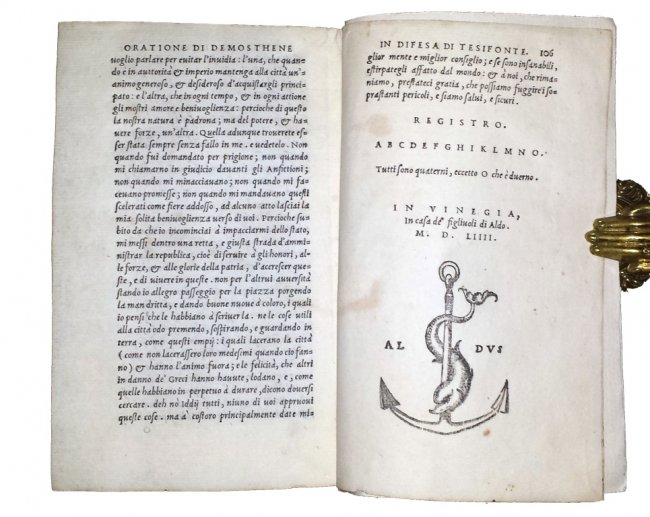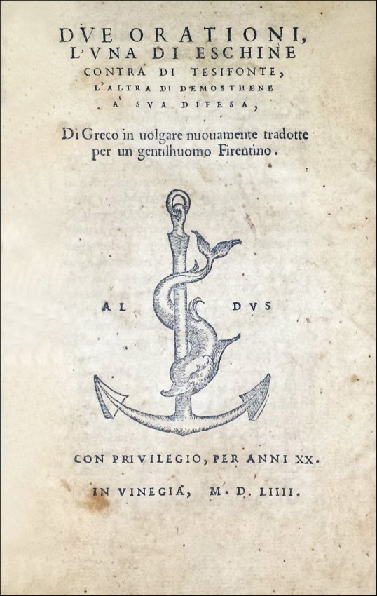 DEMOSTHENES-AESCHINES. Due orationi, l'vna di Eschine contra di Tesifonte, l'altra di Demosthene à sua difesa. Di greco in volgare nuouamente tradotte per un gentilhuomo firentino [sic]. In Vinegia: [Venice: heirs of Aldo Manuzio], 1554.