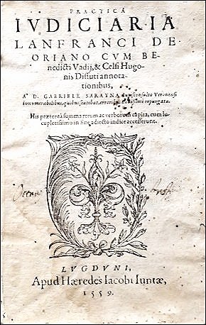 Oriano, Lanfrancus (De). Practica iudiciaria Lanfranci De Oriano, cum Benedicti Vadii, et Celsi Hugonis annotationibus. A Iacobo Boniour plurimis axiomatibus, in schematibus proximè locupletata. Ad Cardin. Lotharingum Carolum Lotharing. Lugduni, apud Haeredes Iacobi Iuntae, 1559.