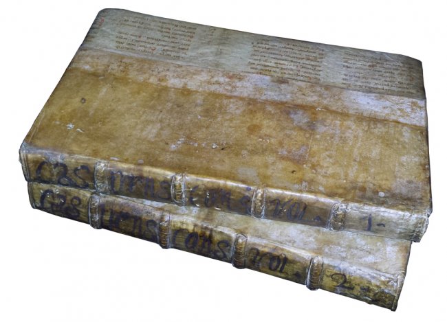 3 parts bound in 2 volumes in-folio (360x226), contemporary stiff vellum with a part from an ancient early manuscript, calligraphic title on four raised bands spines, ff. [2], 242, [18]; 222, [12]; 42, [8].