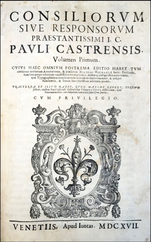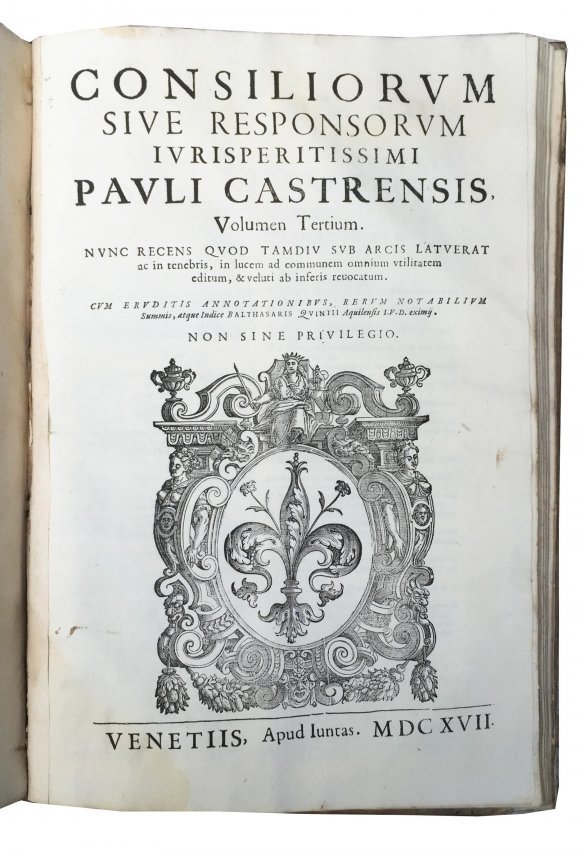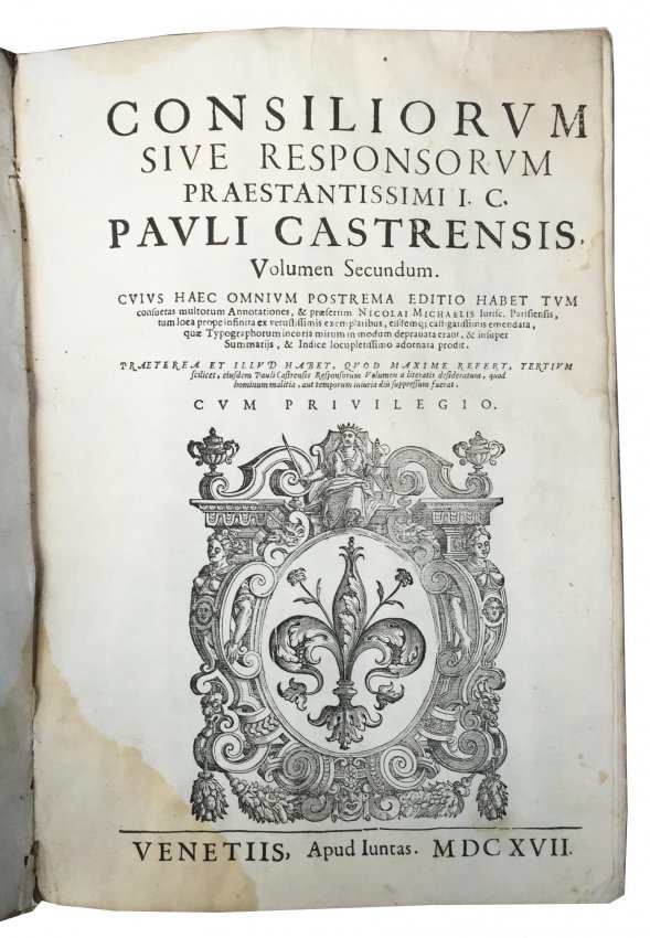 DI CASTRO, PAOLO. Consiliorvm sive responsorvm [...] cvivs haec omnivm postrema editio habet tvm consuetas multorum adnotationes, & praesertim Nicolai Michaelis [...] emendata [...].Venice, Giunti, 1617.
