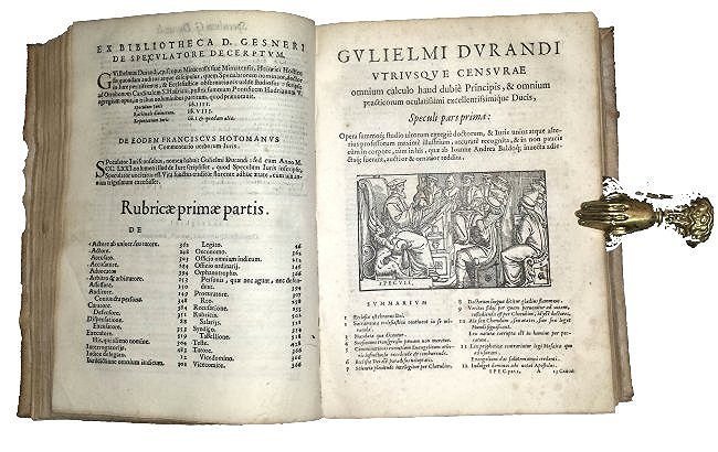 Guillaume Durand (1237-1296) was a French jurist and ecclesiastical. His career was brilliant in both the areas: at first he was Canon Law teacher in Modena, then auditor in Rome, Bishop (from 1290) in Mende, in Lozèr, and Archbishop in Ravenna (from 1295), as well as rector in Romagna and Marche. He is remembered for the present work, that led him to be condemned by Dante in Epistole (Ep. XI, 16) as an exponent of the formalist doctrine, and for a treatise on the symbology of ecclesiastical architecture and liturgical celebrations (Rationale divinorum officiorum, ca. 1280).