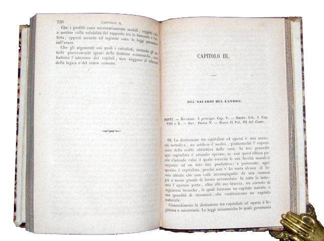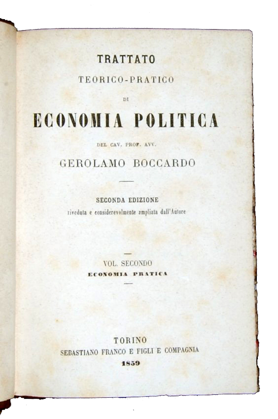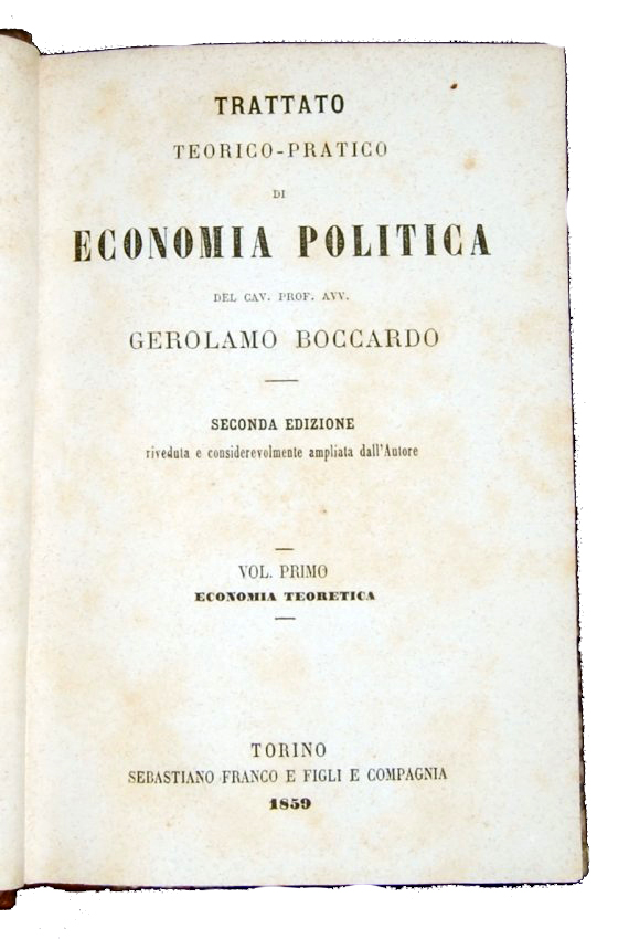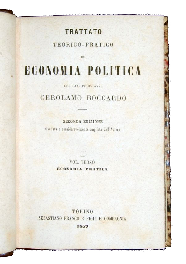 Boccardo, Gerolamo. Trattato teorico-pratico di economia politica del Cav. Prof. Avv. Gerolamo Boccardo. Seconda edizione riveduta e considerevolmente ampliata dall'Autore. Vol. Primo [-Terzo]. Torino: Sebastiano Franco e Figli e compagnia, 1859.
