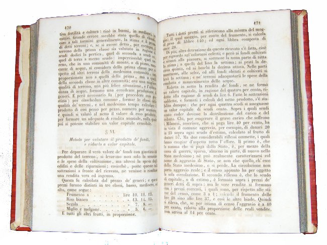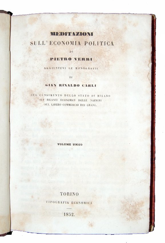 Verri, Pietro. Meditazioni sull'economia politica di Pietro Verri aggiuntevi le monografie di Gian Rinaldo Carli sul censimento dello Stato di Milano sui bilanci economici delle Nazioni sul libero commercio dei grani. Volume unico. Torino: Tipografia Economica, 1852.